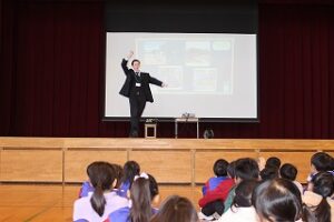 質問タイムでは「アメリカにはどんな生き物が棲んでいますか」「アメリカには給食はありますか」など、多くの児童が手を挙げて、米国について学びました。