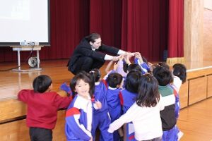 米国出身の国際交流員が来校し、1、2年生の児童と交流を深めました。