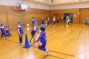 バトンを渡す、または受け取るタイミングを意識しながら取り組みました。「がんばれ」「あと少しだよ」と歓声が上がり、とても盛り上がりました。