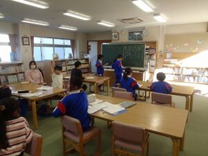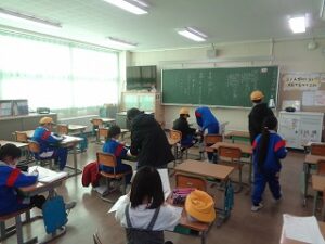 学友区ごとに集まって、これまでの登下校についての振り返りをしたり、冬道の歩き方について注意する点を確認したりしました。特に冬道では、一列になって歩く、雪が落下するおそれのある軒下を通らない、積雪時には自転車に乗らない等、身を守るためのルールを確認しました。