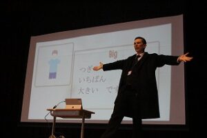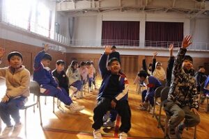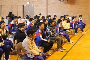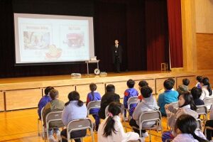 1、2年生を対象とした授業で、故郷であるカリフォルニア州の紹介があり、新湊大橋の5倍以上の長さがある「ゴールデン・ゲート・ブリッジ」や、日本にいるヒグマより大きい「グリズリーベアー」の話を聞いて、子供たちは「見てみたい」「行ってみたい」と声を上げていました。