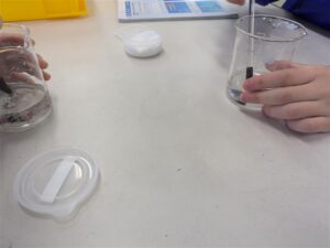 食塩とミョウバンそれぞれ2グラムずつを水に加え、全て溶けるまでかき混ぜました。