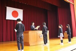 代表の児童が「社会科の自主学習をがんばった」「なわとびの技を磨きたい」等、1年間のがんばりや、来年度にがんばりたいことを発表しました。