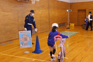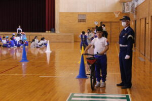 自転車に乗る前の安全点検の合言葉「ぶたはしゃべるら」のお話や小学生は自転車に乗ったときには歩道を通ってもよいこと等、たくさんのことを教えていただきました。話の後には、体育館に設置したコースを自転車に乗って、走行しました。各地点で警察署の方や交通安全協会の方々に丁寧に教えていただきながら、無事に全員「合格」することができました。子供たちも「やったー!」と声を出し、喜んでいました。今日、学習したルールをしっかりと守り、自転車を安全に利用してほしいと思います。